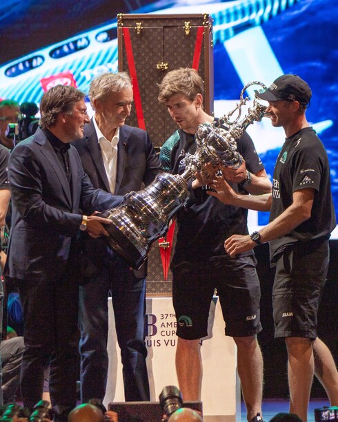 Congratulations to Emirates Team New Zealand for winning the Louis Vuitton 37th America's Cup Barcelona. To commemorate the sailors for their outstanding achievements and contributions to the sport, Bernard Arnault, Chairman and CEO, LVMH and Pietro Beccari, Chairman and CEO, Louis Vuitton awarded the victorious team with the emblematic Auld Mug Cup.