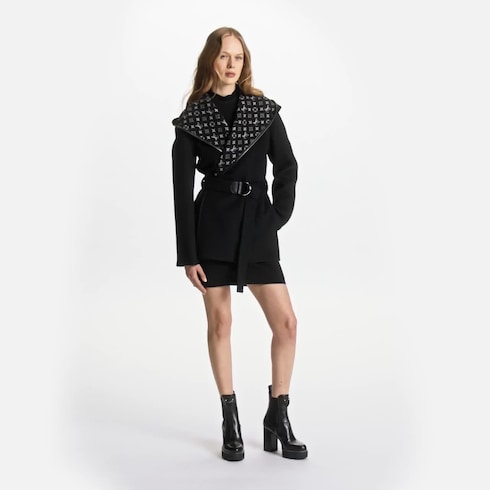 This chic short wrap pea coat is updated for the season in a fresh colorway and signed with the collection’s Louis Vuitton Paris belt for a contemporary touch. The double face wool-silk blend is soft, lightweight and warm, with a voluminous hood amping up the coziness. Complete with an iconic Monogram jacquard on the inside.