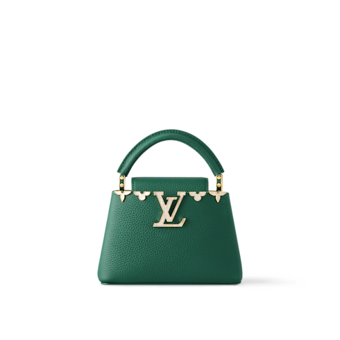 This Capucines Mini makes an elegant statement with its vibrant yet sophisticated Malachite colorway. The iconic double-carry design is updated in refined Taurillon leather adorned with a jewelry-inspired, mother-of-pearl crown depicting Monogram Flowers. It is also embellished with gold-toned LV Initials and is fitted with a compartmented interior, which includes a flat pocket. The detachable strap provides the option to wear it cross-body.