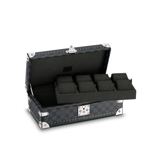 This 8 watch case is crafted in classic Monogram canvas. It easily goes from safe to suitcase and has a removable tray to hide other valuables.