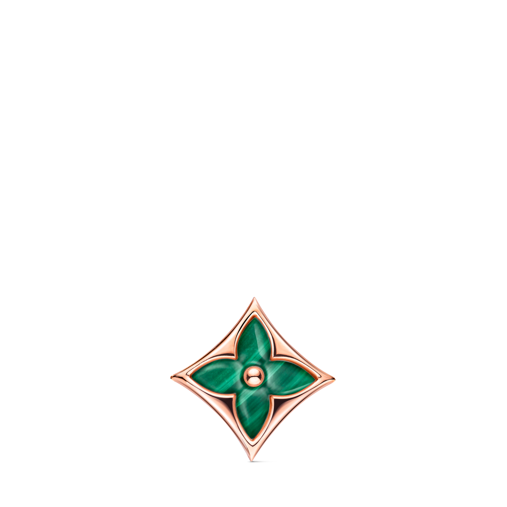 The Color Blossom Sun Ear Stud is a tribute to Louis Vuitton's characteristic Monogram Flower. Fashioned from 18-karat rose gold, the studs are set with hand-polished green malachite which contrasts beautifully with the metallic pink hue for a contemporary aesthetic. They can be worn as a pair, alone or complemented by other Color Blossom earrings.
