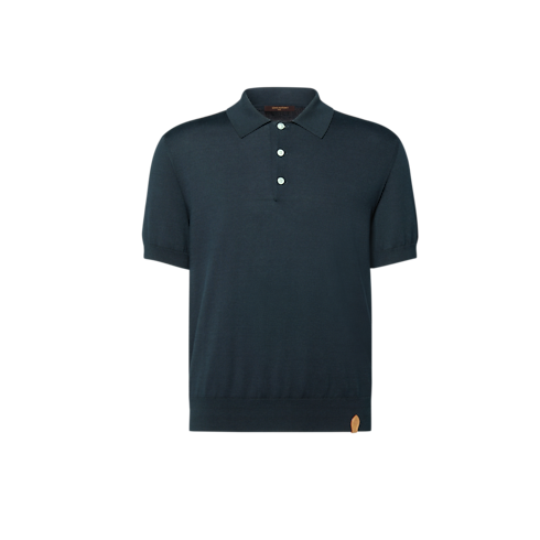 This navy blue short-sleeved polo shirt brings understated luxury to an ensemble with its lustrous fine gauge cotton-silk knit. Discreet signatures include LV stitching on the top button and a VVN leather tab on the bottom left hem. This versatile piece pairs effortlessly with everyday and formal looks.
