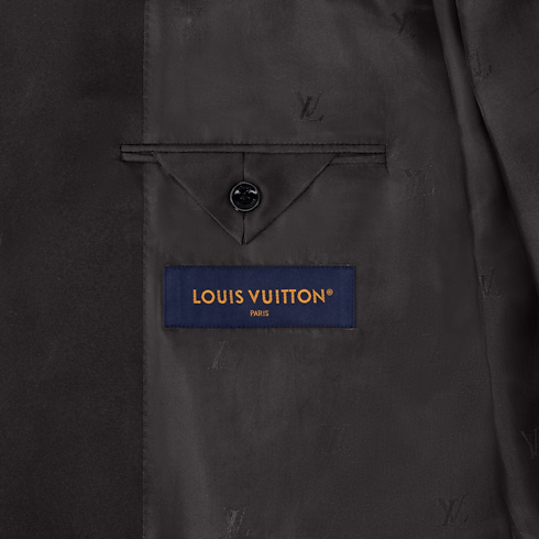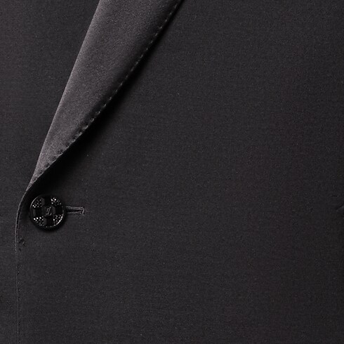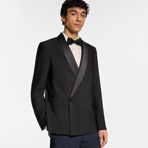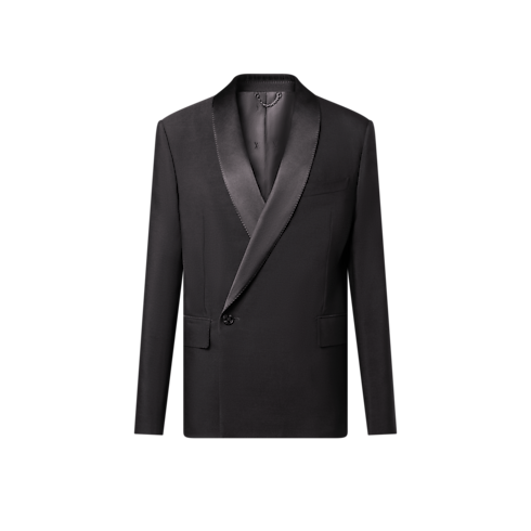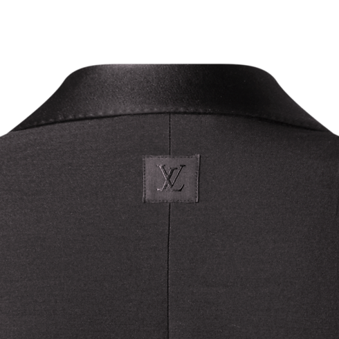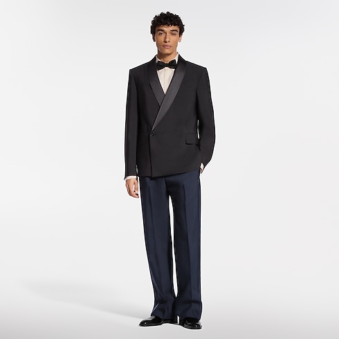 Minimalist lines accentuate the impeccable elegance of this double-breasted tuxedo jacket, tailored from black wool-silk crepe with a satin shawl lapel. A single jewel-like signature button adorns the fastening while pick stitching adds a classic sartorial detail. Finishing touches include a woven LV label on the back and LV Blason lining. Matching pants make a chic evening set.