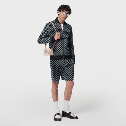 An allover LV Fishnet jacquard embellishes this luxurious double face cotton jersey bomber, with pale green LVs against a dark blue background recalling the nautical universe of this collection. The same motif in contrasting orange on the inside spotlights the House’s savoir-faire and underlines this piece's discreet refinement. This graphic layer has matching shorts for an effortless contemporary ensemble.