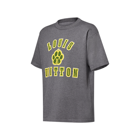 This preppy short-sleeved organic cotton crewneck features a playful woven image of a heraldic-looking paw print accompanied by college-inspired Louis Vuitton and LV lettering on the chest and back. The bold motif in green and yellow tones is surrounded with a delicate beaded outline bringing a sophisticated twist to this graphic piece.