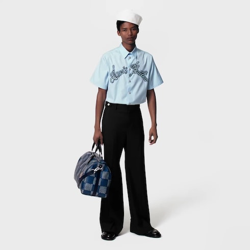 This short-sleeved blue cotton shirt is a timeless staple of the menswear wardrobe, which has been given a dandy twist with glittery embroidered Louis Vuitton patches in a cursive script across the chest. This sophisticated piece instantly elevates an everyday look.