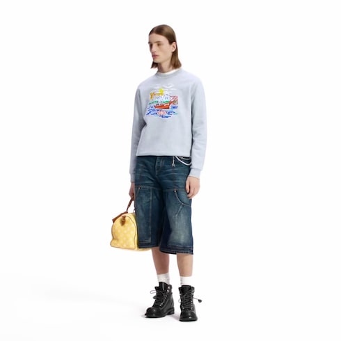 Crafted in a versatile pale gray, this soft cotton sweatshirt is adorned with vibrant embroidery from the Fall-Winter 2025 show. The signature motif celebrates the long-standing friendship behind this collection’s Pharrell and Nigo collaboration, with the two artists depicted in a fishing boat in an idyllic setting. A leather Marque L.Vuitton Déposée label on the back completes this casual piece.
