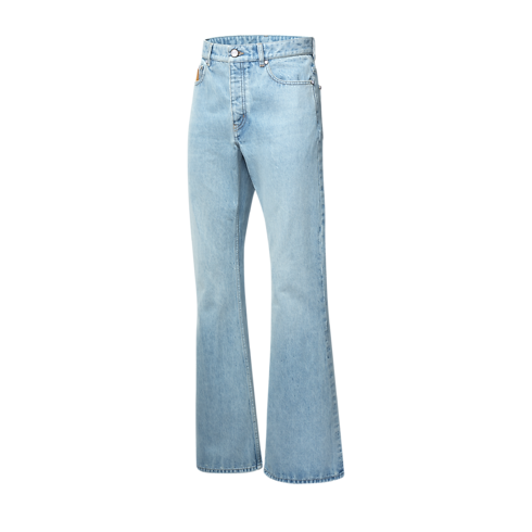 These flared jeans, crafted from premium Japanese denim, are a wardrobe essential enhanced with the Louis Vuitton savoir-faire. With their timeless light blue wash and their trendy silhouette, they can be effortlessly styled with any look. Exclusive details include tobacco-toned topstitching, an embroidered LV signature on a rear pocket and signed nubuck patches on the ticket pocket and waist.
