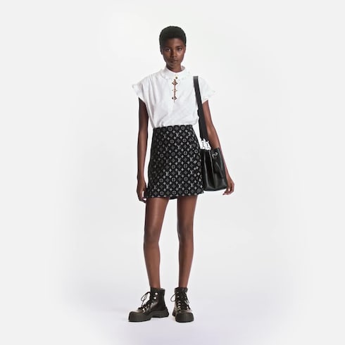 Tailored from soft cotton poplin embellished with Monogram fil coupé, this Frill Blouse features rich details such as gold LV buttons at the collar and golden Monogram Flower shape embellishments along the front. With feminine frill details at the collar and sleeves, this iconic Louis Vuitton piece is a wardrobe must-have.