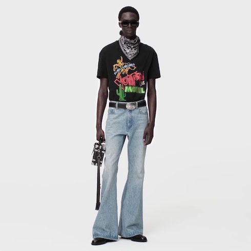This black t-shirt in a light summery cotton is embellished with a Vuitton Motel motif from the FW24 Show. Printed and adorned with crystals, the playful signatures evoke the neon-lit cities of the American West. This fashion-forward piece brings a graphic twist to casual summer looks.