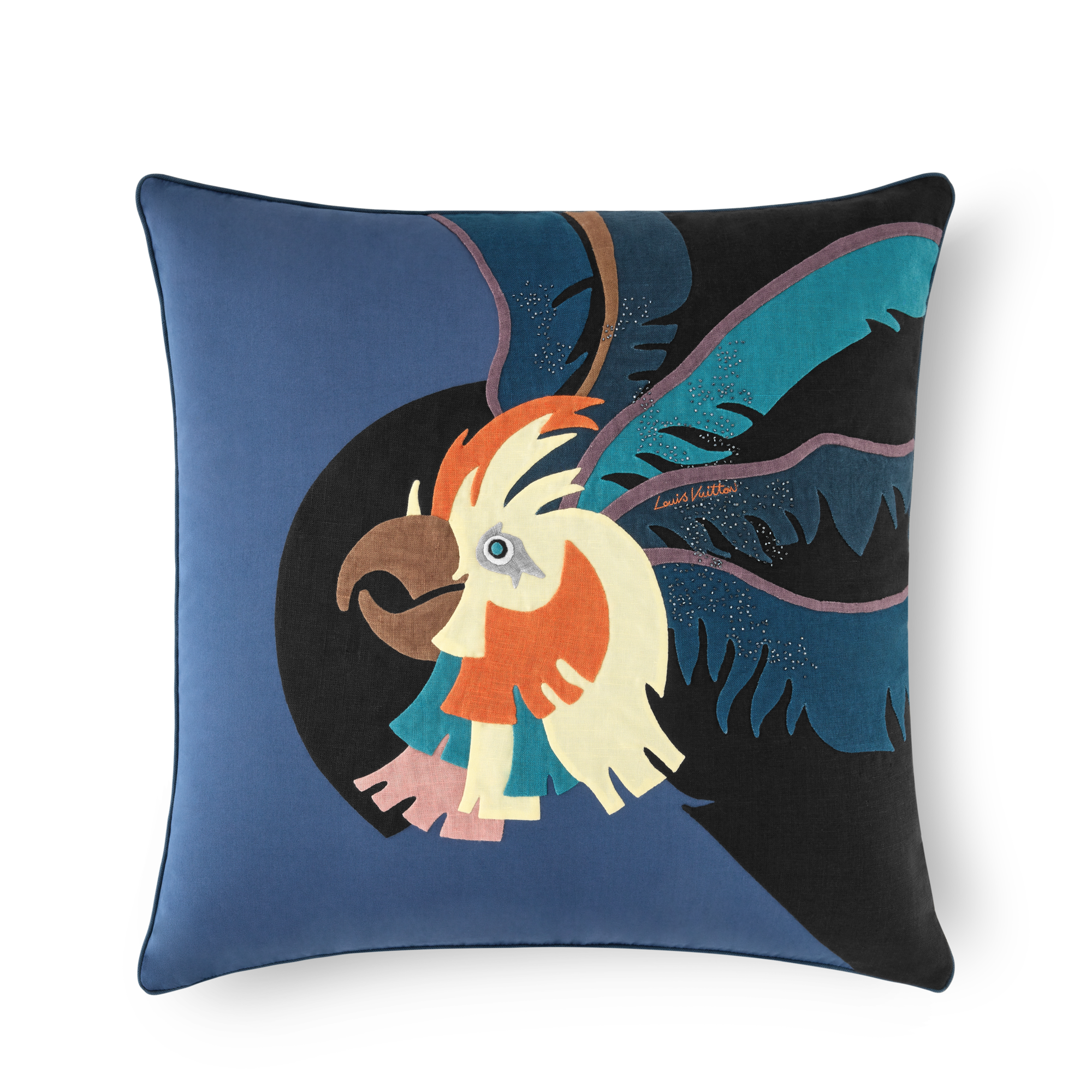 The bold graphic pattern of the Animali Fantastici Fish cushion features an original image by Fortunato Depero, an Italian artist prominent in the Futurist movement of the early 20th century. Four stylized fish in an eye-catching palette of aquatic colors are depicted in linen cutouts hand-embroidered on a plush cotton base, heightened with lustrous glass beads. A strikingly creative addition to any interior, this plush cushion exemplifies Depero’s joyful, dynamic aesthetic vision.