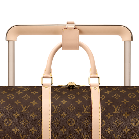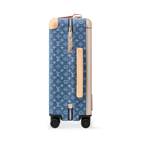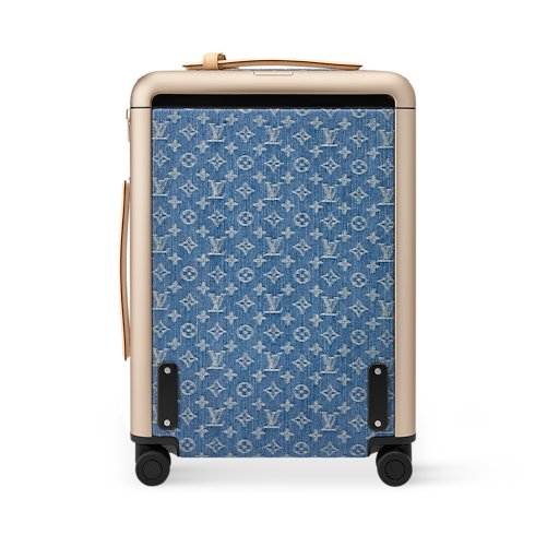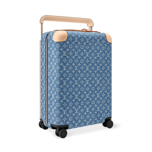 The Horizon 55 rolling suitcase is crafted from Monogram Denim, accented with natural cowhide-leather corners, top handle, and cane handle. The denim lends casual elegance to this cabin-sized piece, while its innovative exterior cane maximizes interior space. The wide cane handle and four compact wheels ensure optimum maneuverability.