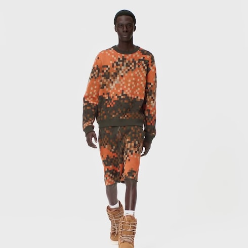 This light cotton pullover is embellished with a graphic Damoflage motif from the FW24 Show, featuring eight colors of yarn intricately woven into a sophisticated jacquard. An embroidered ‘L.Vuitton Marque déposée’ accents the chest while a studded LV Lovers logo embellishes the back. This versatile transeasonal layer makes a casual set with matching shorts.