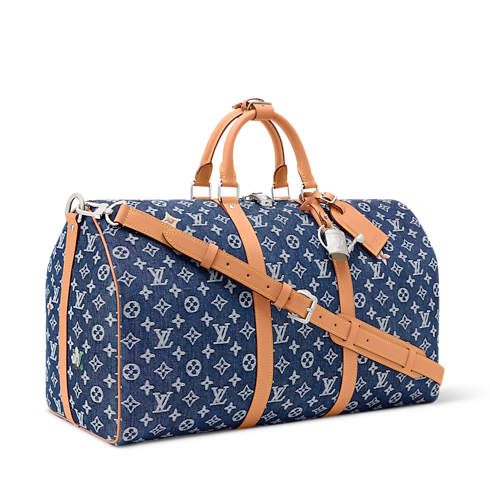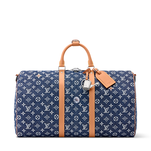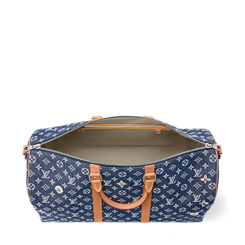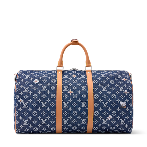 The Keepall Bandoulière 50 showcases the House’s new take on denim, with the Monogram pattern woven directly into the fabric. Treated for durability and washed to achieve its final look, the denim is then embroidered with delicate white flowers. A new metal watering can charm adds a stylish, eye-catching detail.