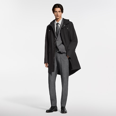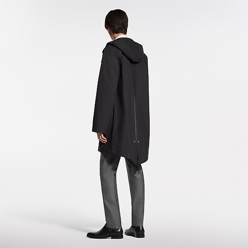 This water-repellent black hooded parka is an elegant and functional light outer layer crafted from technical cotton ripstop. Sophisticated details elevate the minimalist silhouette, with an LV snap button at the top of the zipper placket, Monogram Flower eyelets and rivets and leather LV Lozine embossed tape on the back in homage to the House’s travel heritage. A versatile piece for business or weekend looks.