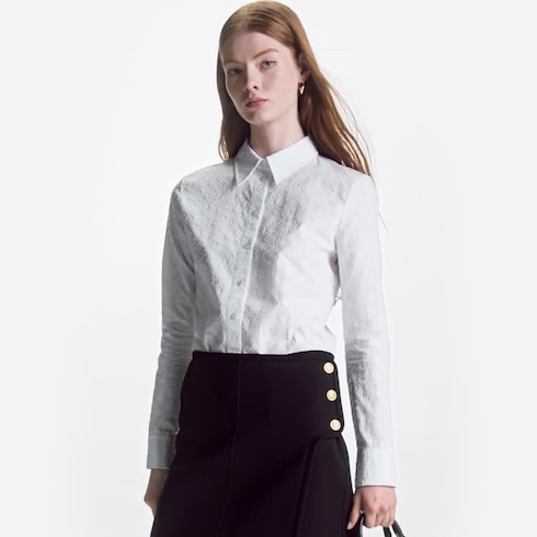 With its iconic shape, this Long Sleeved Fitted Shirt is a key component in the contemporary woman’s wardrobe. Its soft cotton poplin fabric is embellished with an elegant allover Monogram motif in fil coupé. On the sleeve, a Monogram Flower tab adds to the signature effect.