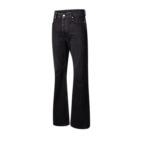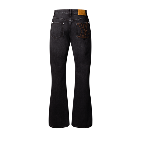 These flared jeans, crafted from premium Japanese denim, are a wardrobe essential enhanced with Louis Vuitton savoir-faire. With their timeless black wash and fashion-forward silhouette, they can be effortlessly styled with any look. Exclusive details include an embroidered LV signature in tobacco-toned topstitching on a rear pocket and signed nubuck patches on the ticket pocket and waist.