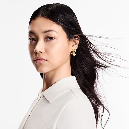Each piece in this set of LV Floragram earrings highlights a different Louis Vuitton symbol. The coordinating designs individually showcase a pointed Monogram Flower, a rounded Monogram Flower, and the LV initials. A shared celebration of iconic motifs unites this trio of mismatched earrings for a youthful take on House signatures.