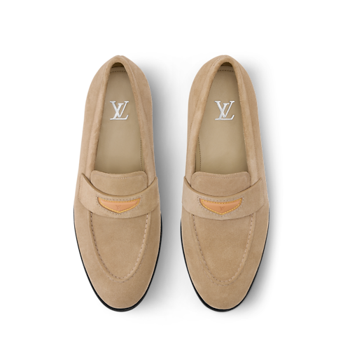 Crafted from suede calf leather, the LV Gent loafer has an exceptionally soft, supple feel, the result of both its fine material and its traditional sacchetto construction. The strap on the upper is embellished with a natural leather insert, which is embossed with the LV Initials and accented with yellow stitching, recalling the House's leather goods.