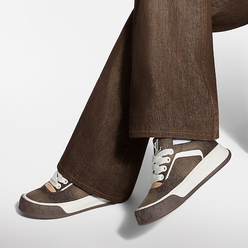 The LV Tilted sneaker is interpreted in 'Coffee Bean' denim, developed for the ready-to-wear collection. An elevated take on denim, the fabric is not dyed, but instead woven to create a faded, worn-in effect. It enhances the vintage feel of this sneaker, which was inspired by the early 2000s, and features natural leather trim and tilted LV Initials signatures.