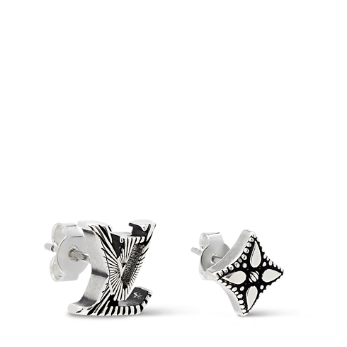 Constructed from versatile sterling silver, the LV Whisper stud earrings brim with nuance and mood. The pairing of a Monogram Flower and a set of LV Initials is rendered in dramatic relief, sculpted and finished with black. This intriguing collection of details enhances daily wear.