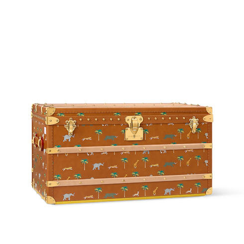 Inspired by the film, LV x The Darjeeling Limited Courrier Lozine 90 is crafted from elegant tan leather with a vintage allure. Colorful illustrations of animals and palm trees create a preppy yet naïve aesthetic, echoing the movie’s captivating, nostalgic universe. The trunk is numbered "11" to echo the movie.