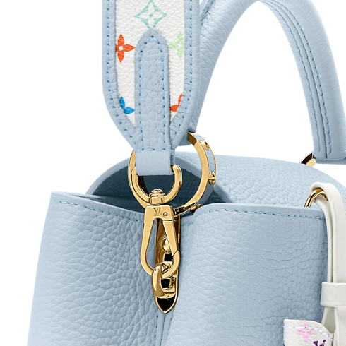This elegant Capucines BB is updated for the House's exclusive anniversary collection, celebrating 130 years of the Louis Vuitton Monogram. Designed in collaboration with Takashi Murakami, this playful edition is offered in Olympian Blue Taurillon leather accented with multicolor Monogram trims, including a bow-shaped keybell. The signature gold-toned padlock lends a sophisticated finish.