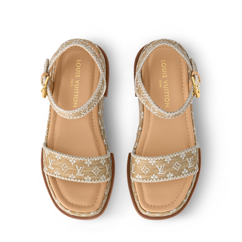 The Maya platform sandal is given a chic, artisanal twist in raffia embroidered with the Monogram pattern. Decorative stitching on the two straps adds to the appeal of this design, whose easy-to-wear flatform is also covered in Monogram raffia. This model is finished with a rubber outsole.