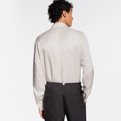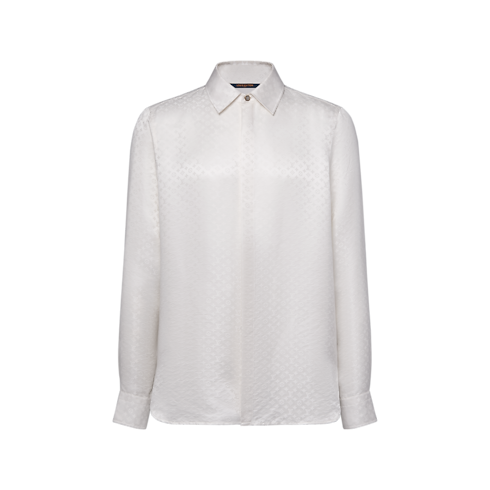 This white silk shirt is a sophisticated choice for evenings. It is embellished with a jacquard Mini Monogram motif, whose tone-on-tone play of matte and smooth textures highlights the fabric’s fluid drape and natural luster. This versatile shirt can be styled with any evening set or as a sophisticated standalone piece.