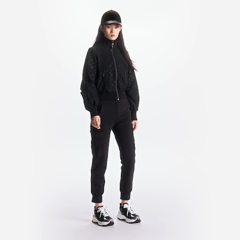 A classic cargo pants silhouette with a signature spin. The House’s iconic technical jersey refines the sporty cut with a crisp finish, while this season’s embossed Monogram jersey discreetly signs the waistband, patch pockets and cuffs. Coated ankle zippers accentuate the sleek, contemporary style. A Monogram canvas tab picks out one of the piped pockets.