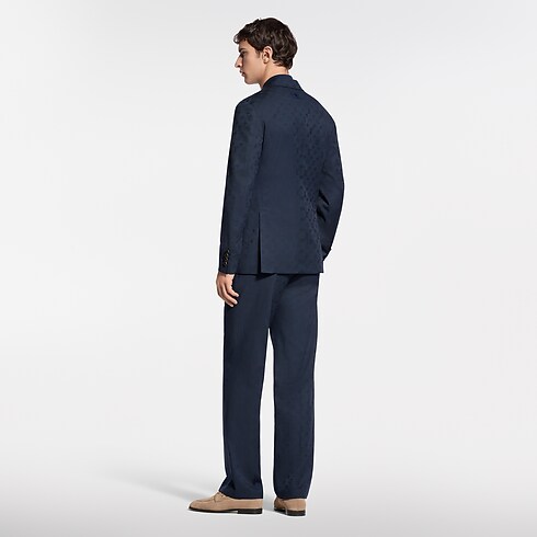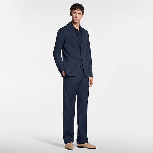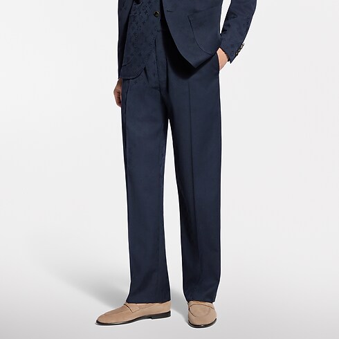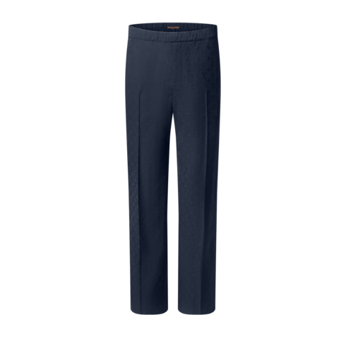 These fluid drawstring pants are tailored from timeless navy blue wool suiting elevated with a tone-on-tone jacquard Monogram motif. A comfortable elasticated waist and creased front enhance the fabric’s drape and natural luster. Pair with a matching Napolitana jacket for an effortlessly refined suit that can be dressed up or down according to the formality of the occasion.
