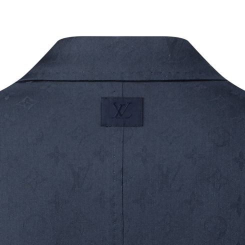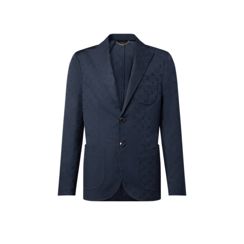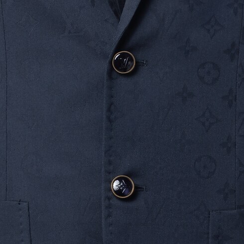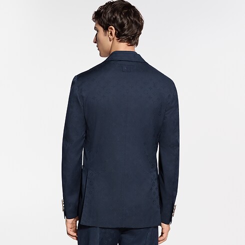 This softly tailored single-breasted Napolitana jacket is light, comfortable and elegant. The timeless navy blue wool fabric is elevated with a tone-on-tone jacquard Monogram motif offering a subtle play of matte and lustrous accents. Matching drawstring pants make a refined set that can be dressed up or down, with a matching shirt or a light knit for an effortless look.