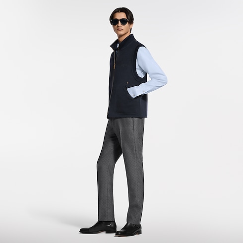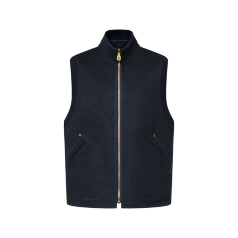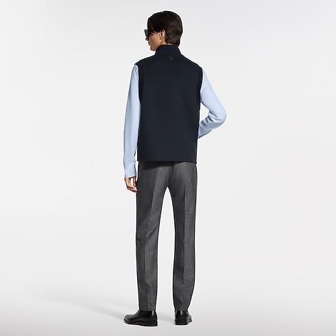 This reversible navy blue gilet is a perfect midseason layer that can be styled over a shirt or pullover or under a jacket. Crafted from double-face fabric in a warm and luxurious blend of wool, cashmere and silk, it has a timeless plain side signed with discreet rhinestones on the chest, LV Flower rivets on the pockets and a leather patch on the back, while a tonal jacquard Monogram motif lends a graphic accent to the reverse.