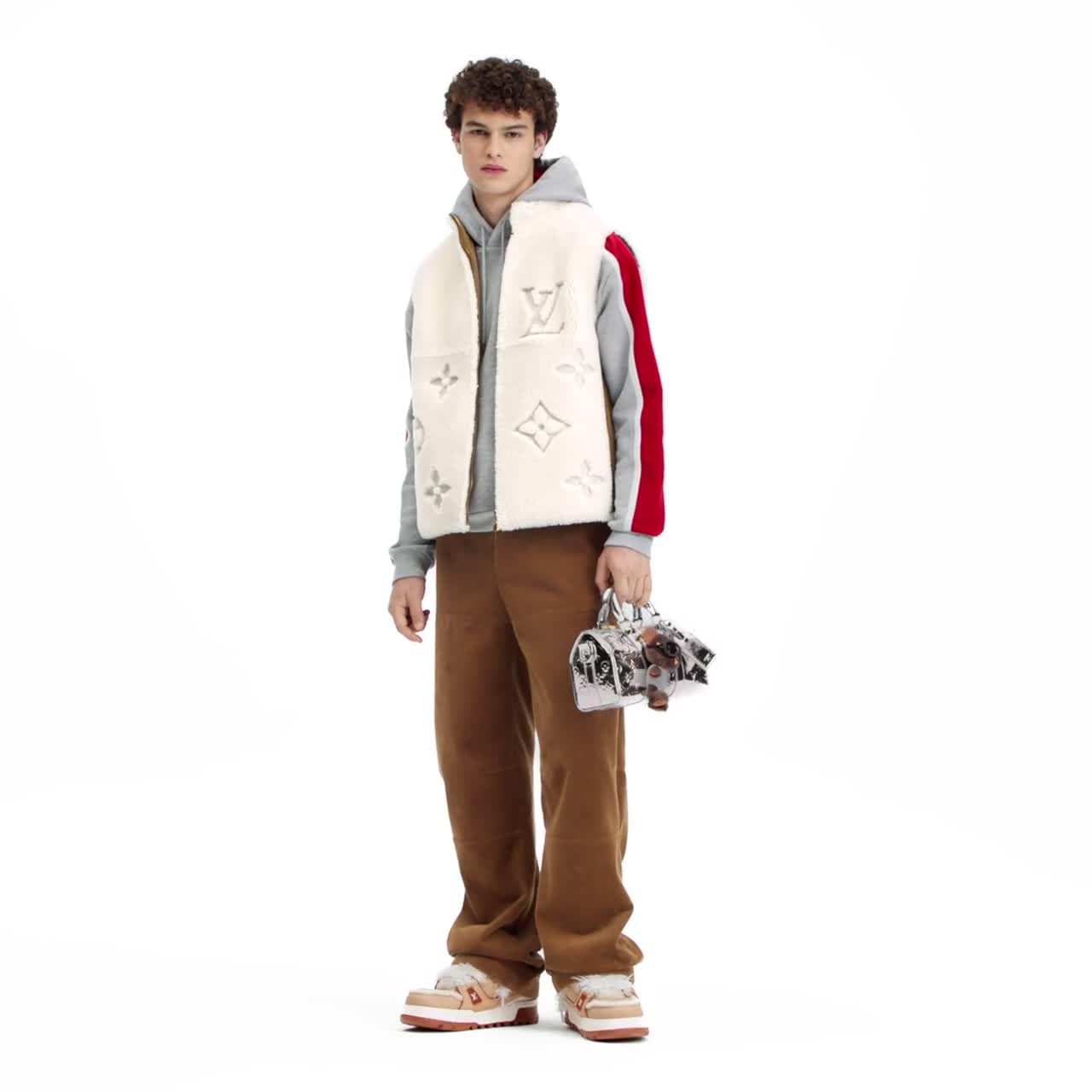 This reversible white shearling workwear gilet is a luxuriously warm and soft layer that can be styled many ways. A scaled-up Monogram motif is trimmed into the fur on the shearling side and finished with knitted-effect embroidery. Reversed, the workwear-inspired silhouette in canvas and corduroy is elevated with a metal LV ornament on the chest, Monogram Flower rivets, and VVN-colored leather signature patches.