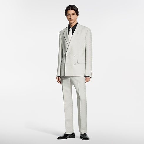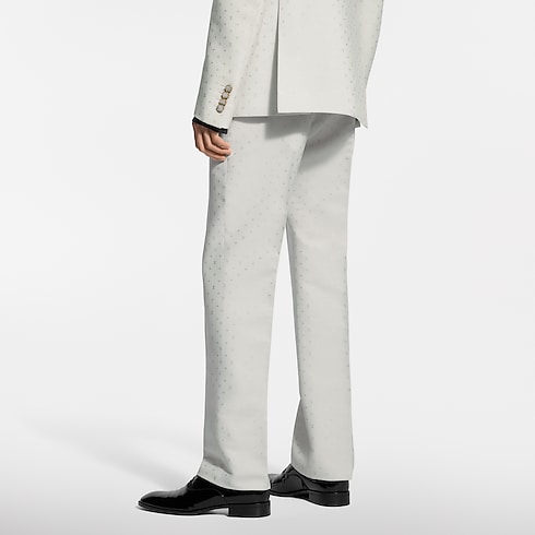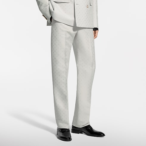 These tailored evening pants stand out from the crowd in a pale ivory hue for summery celebrations. Crafted in a luxurious blend of silk and mohair, they are adorned with a tone-on-tone jacquard Spaced Mini Monogram motif, which is expressed in a subtle play of matte and lustrous textures. A matching double-breasted jacket makes a sharp suit.