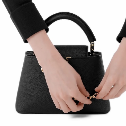 The iconic Capucines line welcomes this new personalised edition, in an exclusive small size in between the Mini and BB. Choose between 7 leather colours & customise a unique chain thanks to three unique charms, from bi-galvanised letters to crystals lucky charms featuring Louis Vuitton signatures. The bag is finished with sleek gold-toned hardware.