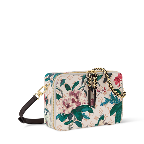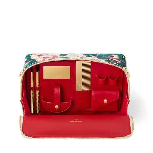 Introducing the Nécessaire bag from the Monogram Eden animation. This elegant multifunctional style is crafted from Monogram Dune canvas, which is beautifully decorated with a vibrant floral pattern. It is trimmed with cowhide and opens to reveal a striking red lining with seven pockets to store a smartphone and cosmetic items. It includes two brushes, a comb, and a mirror, with the possibility of adding an eyeshadow and two lipsticks. The gold-toned hardware lends a refined finish.
