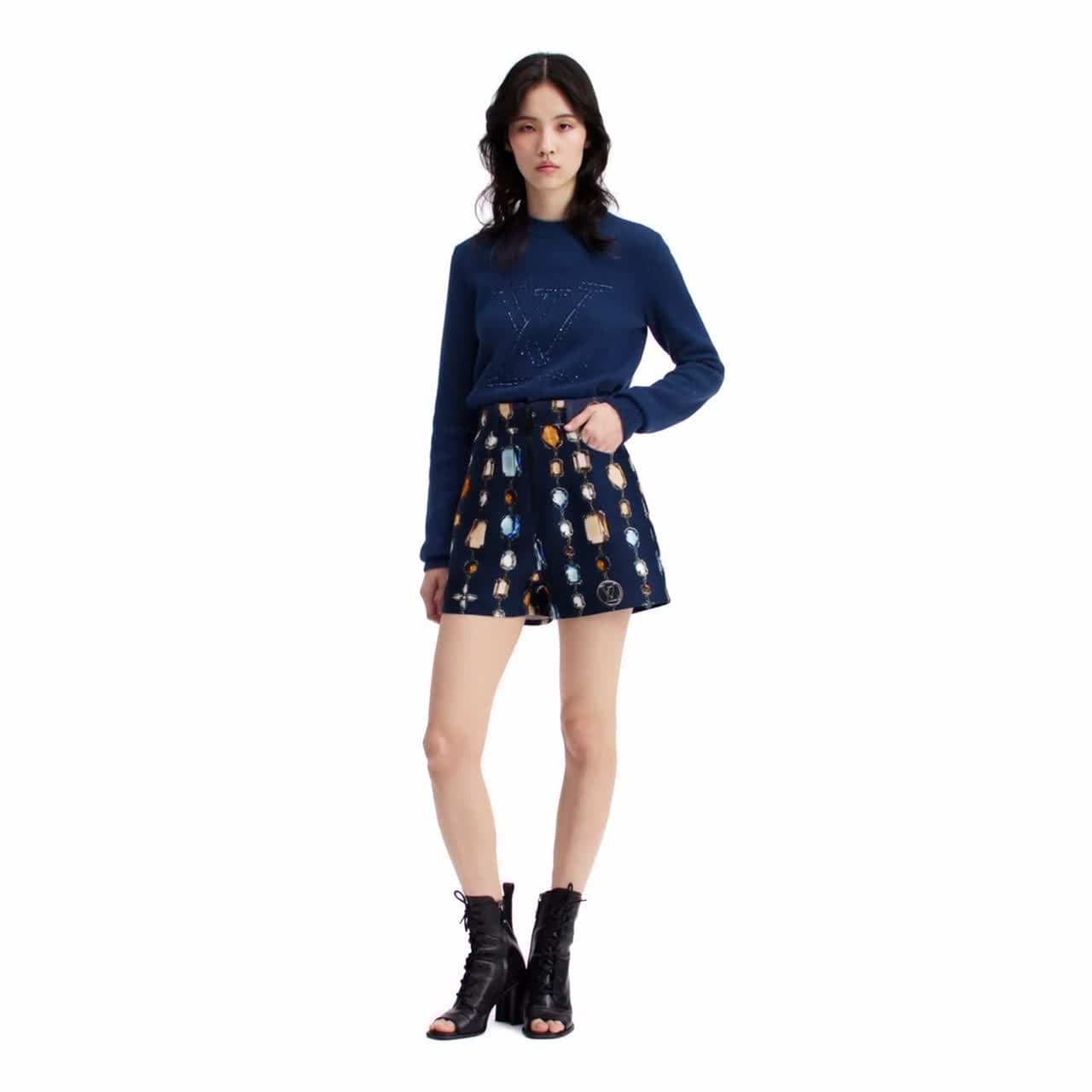 These shorts make a sophisticated statement in refined wool-silk mikado featuring an allover print of this season’s striking necklace motif, which twists Louis Vuitton charms with an array of colorful precious gemstones. They are cut in a clean, tailored shape, while an exposed a zipper fastening completes the look with a contemporary twist.