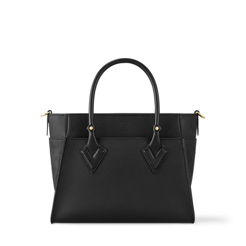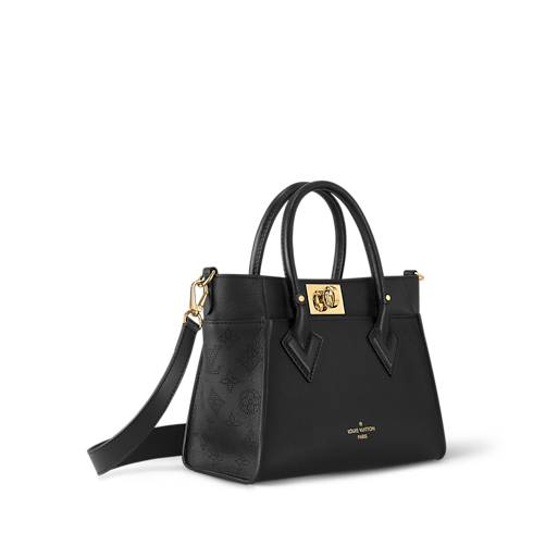 The On My Side tote bag is made from calf leather, with perforated calf leather on the gusseted sides. The elegant colorway is livened up with a gold-color twist closure and gold-color buckles on the removable strap. Two outside pockets and a roomy interior makes this a practical bag.