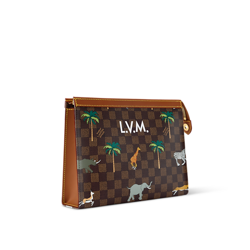 Part of the LV x The Darjeeling Limited collection, the Pochette Voyage MM is made from Damier Ebene Heritage coated canvas, playfully decorated with giraffes, rhinos, and palm trees. The darker canvas and brown leather trim make the illustrations pop. A zipped main compartment and magnetic back pocket add everyday practicality.
