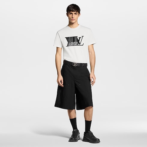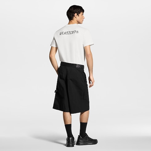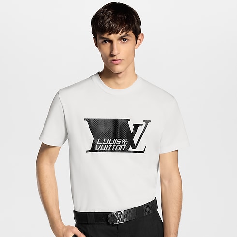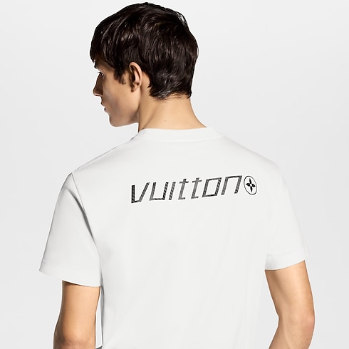 Graphic signatures adorn this classic white T-shirt in light cotton jersey. A black LV Sprinter motif on the front is printed with a textured trompe l’oeil carbon fiber effect. Vuitton lettering with a Monogram Flower is printed with the same technique on the back. This technical-looking piece can be layered to great effect with this season’s black silhouettes.
