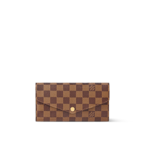 Damier Azur canvas brings a fresh look to Louis Vuitton's Sarah wallet, a timeless model with a simple, elegant exterior and a well-organized interior. Its envelope-style flap, which is secured with a gold-tone press-stud, opens to reveal two large compartments, multiple card slots and a zipped coin pocket.