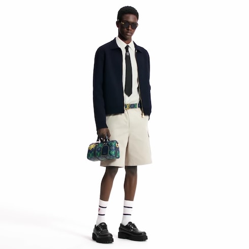 These transeasonal cotton workwear shorts in an elegant pale beige color are distinguished with tone-on-tone embroidered signatures on each of the cargo pockets while a Louis Vuitton Malletier patch adorns the rear right pocket. A pearly button fastening adds a sophisticated accent to this timeless wardrobe essential.