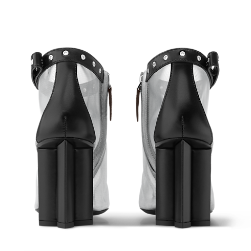 Seen at the Fall-Winter 2025 women's show, the Silhouette ankle boot is made of shimmering nylon mesh, offering a bold new take on transparency. The leather strap around the ankle is embellished with eyelets and LV Initials studs, while the zip has a pull in Monogram canvas. This model comes on a high heel shaped like a Monogram Flower.