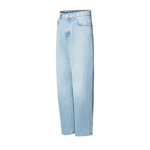 These skate jeans, crafted from premium Japanese denim, are a wardrobe essential enhanced with the Louis Vuitton savoir-faire. With their timeless light blue wash and their casual silhouette, they can be effortlessly styled with any look. Exclusive details include tobacco-toned topstitching, an embroidered LV signature on a rear pocket and signed nubuck patches on the ticket pocket and waist.