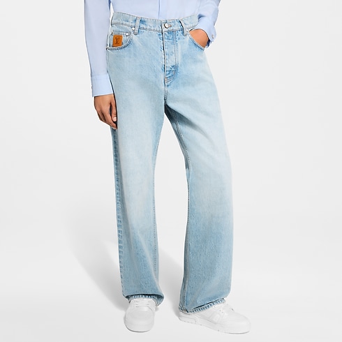 These skate jeans, crafted from premium Japanese denim, are a wardrobe essential enhanced with the Louis Vuitton savoir-faire. With their timeless light blue wash and their casual silhouette, they can be effortlessly styled with any look. Exclusive details include tobacco-toned topstitching, an embroidered LV signature on a rear pocket and signed nubuck patches on the ticket pocket and waist.
