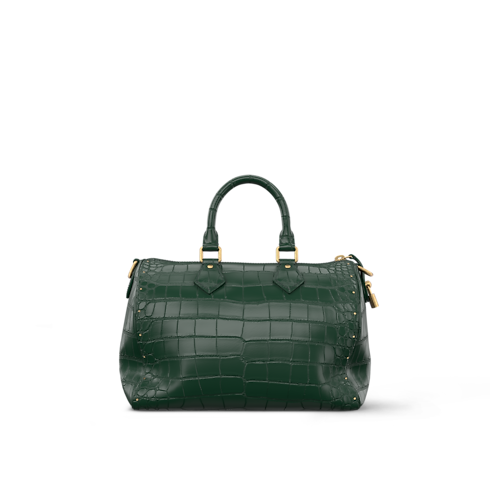 The Speedy P9 Bandoulière 30 is made from crocodilian leather with a finish so exquisitely soft and smooth that Pharrell Williams named it “Butter Crocodile.” Aged-gold-tone rivets accent its classic lines and the name tag, detailed with golden LV Initials. A lambskin lining completes the design, matching the exotic leather’s rich colorway.
