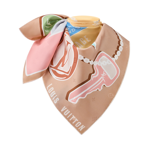 The all-silk Tag And Go square is a creative tribute to the House’s heritage and devotion to the art of travel. Its sophisticated double-face print combines luggage tags from the archives with keys recalling the innovative trunk locks invented by Louis Vuitton himself. Perfect for adding a touch of color and signature elegance to any outfit.