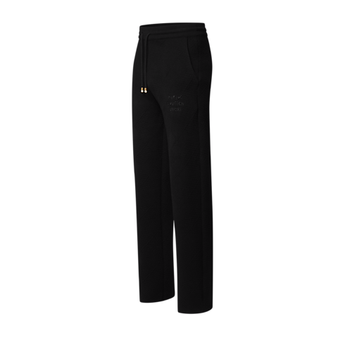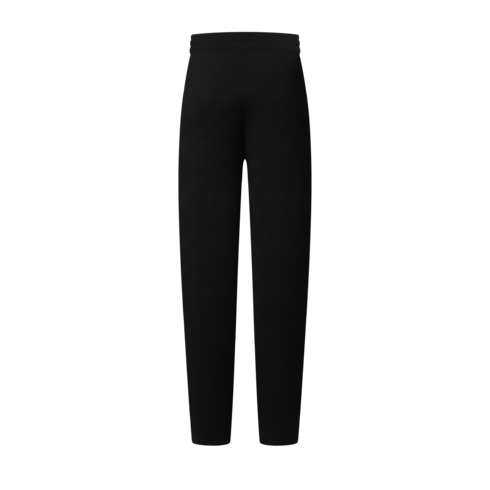 These black knitted wool-blend pants offer a smart take on a casual silhouette with this collection’s allover Damier Argyle motif, expressed in a monochrome knit with a quilted 3D effect. A Marque L.Vuitton Deposée signature is embroidered on the left leg while pearl-effect cord ends adorn the comfortable drawstring waist. A matching bomber makes an elegant set for lounging.