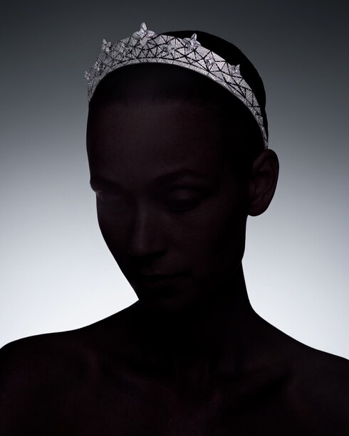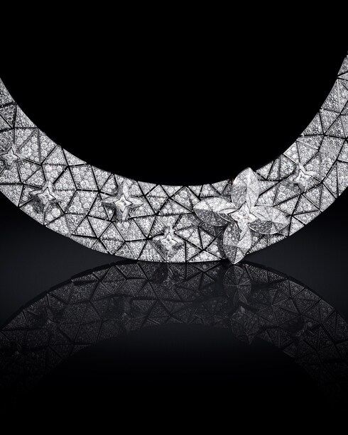 Singularly exploring the pristine white beauty of diamonds, Élégance pays homage to the art of tremblant — multiplying the brilliance of the refined creations. The Maison's signature V unfurls in a graphic interlocking pattern, sprinkled with LV Monogram Star cut diamonds, as a focal point for the Maison's first tiara.